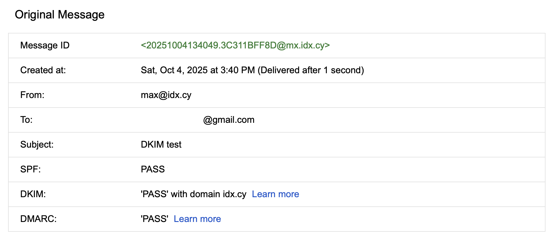 One more thing about email trust. I've read that reverse DNS (PTR record) will boost the reputation of your email server. The thing is that your ISP has to set it up, and I suspect my ISP to reply with a polite "no", so I didn't do it yet. As you'll see in the next section, my email gets delivered to Gmail just fine. I also tested with GMX, but I don't know about Microsoft/Yahoo/Proton.